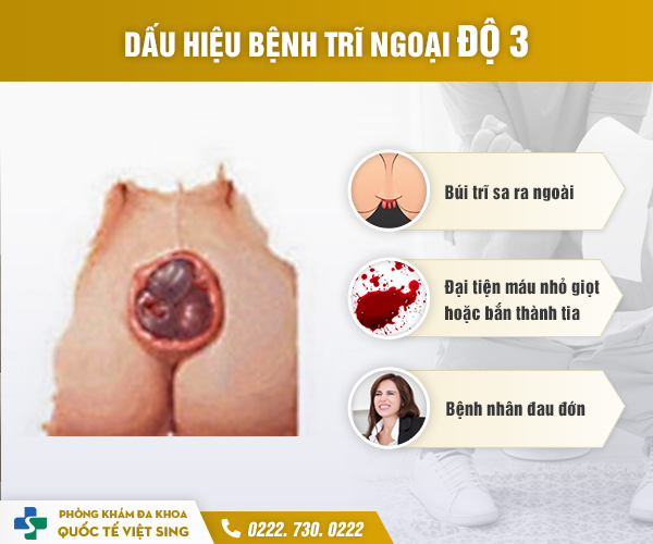 - Trĩ ngoại độ 3: Người bệnh có thể cảm nhận rõ búi trĩ bằng cách dùng tay sờ hay quan sát bằng mắt thường. Đau đớn kéo dài và nghiêm trọng bởi hiện tượng tắc mạch trĩ, hậu môn xuất huyết thành tia hoặc thành giọt diễn ra nhiều hơn.