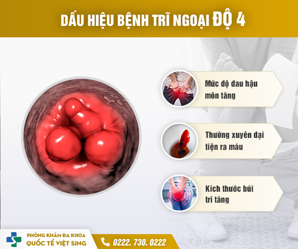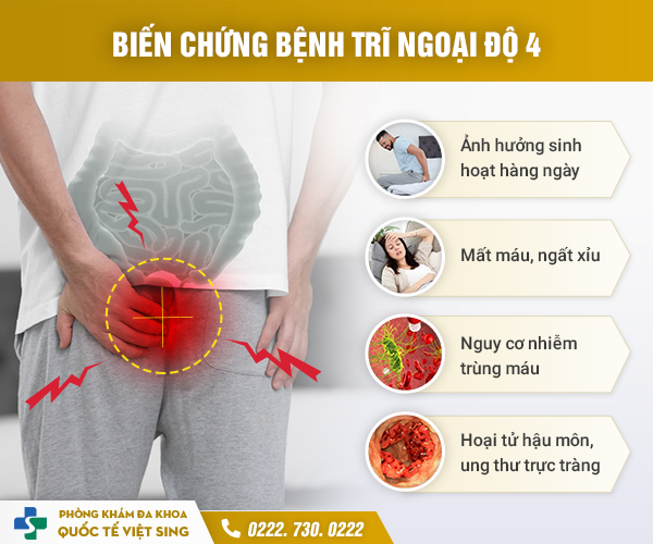 - Với trĩ ngoại độ 4, bệnh nhân có nguy cơ cao bị ung thư trực tràng, đe dọa sức khỏe tổng thể và tính mạng bệnh nhân.