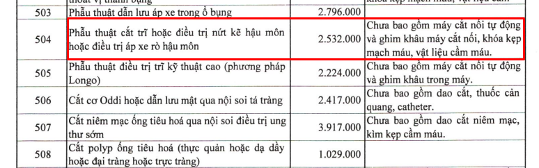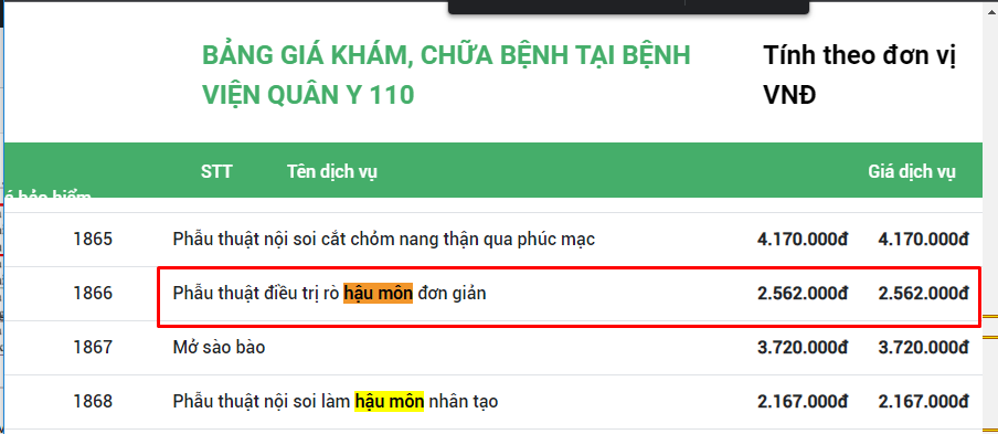 – Tại bệnh viện Quân y 110, chi phí phẫu điều trị rò hâu môn là 2.562.000Đ (chưa bao gồm chi phí thuốc men, bông băng, vật tư y tế, thiết bị y tế hỗ trợ phẫu thuật…)