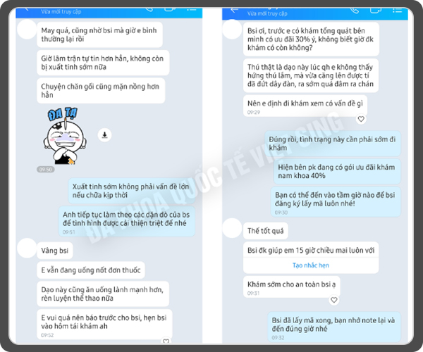 Anh Hoàng Nam (29 tuổi – Bắc Ninh): “Mình có biểu hiện xuất tinh sớm khiến thời gian quan hệ tương đối ngắn, gây ảnh hưởng nhiều đến chất lượng cuộc sống. Mình có đi khám tại Đa khoa Quốc tế Việt Sing và được chẩn đoán, chỉ định mình nên điều trị luôn và mình đã được thực hiện bằng công nghệ SW. Tình trạng bệnh của mình đã cải thiện đáng kể, đời sống cá nhân cũng thăng hoa hơn rất nhiều.”
