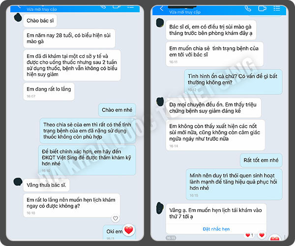 Chị Mai Anh (35 tuổi – Bắc Ninh): “Tôi đã bị nhiễm sùi mào gà từ chồng năm ngoái, và sau đó tôi đã đến bệnh viện xã để điều trị. Tuy nhiên, đốt điện rất đau, và các nốt sùi đã xuất hiện trở lại chỉ sau hai tháng, khiến tôi bị sốt ruột. Bằng cách sử dụng ITC và thuốc Đông tây y, tôi đã khỏi sùi mào gà nhờ sự giới thiệu của bạn về Đa khoa quốc tế Việt Sing Bắc Ninh.”