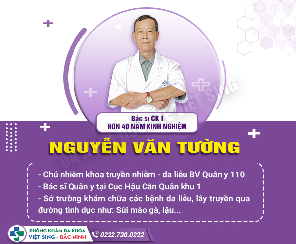 Bác sĩ CK I Truyền nhiễm – Da liễu Nguyễn Văn Tường: Từng tốt nghiệp Học viện Quân Y với chuyên ngành đào tạo bài bản cùng nhiều năm phấn đấu, bác sĩ Tường đã gây dựng thành công tên tuổi của mình. Nguyên Chủ nhiệm khoa Truyền nhiễm – Da liễu Bệnh viện Quân y 110 và hiện đang công tác tại Đa khoa Quốc tế Việt Sing, bác sĩ Tường với chuyên môn, trình độ, kinh nghiệm của mình đã khám chữa bệnh cho hàng nghìn bệnh nhân với hiệu quả điều trị lên tới 98 – 99%.