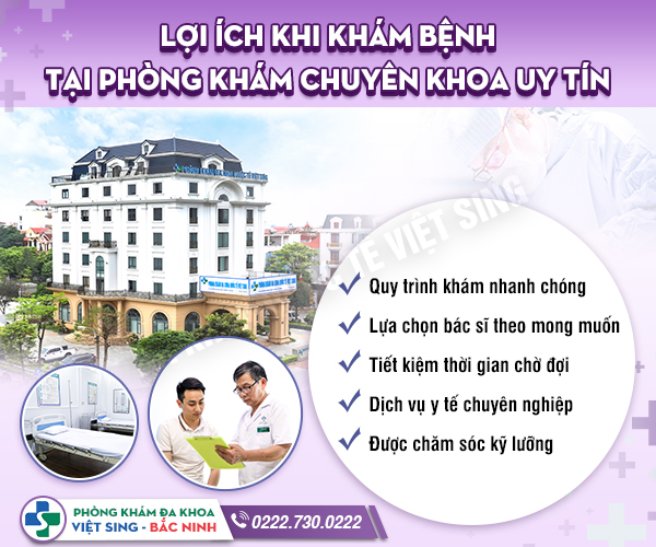 Như vậy, với những thông tin trên, phòng khám Đa khoa Quốc tế Việt Sing tự hào là phòng khám chuyên khoa hàng đầu tại Bắc Ninh với chất lượng tốt, chuyên môn giỏi, chi phí ưu đãi. Bạn có thể ghé đến Việt Sing để thăm khám chuyên khoa bằng cách liên hệ nhanh tại 086 2345 169 hoặc click [Khám bệnh online] để đặt lịch hẹn trước.