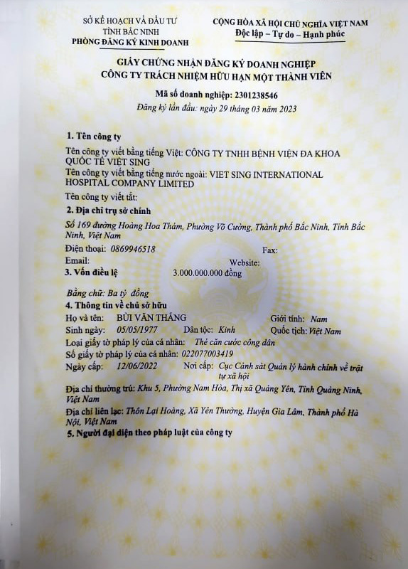 Mọi việc thăm khám, điều trị tại Đa khoa Quốc tế Việt Sing đều được Sở Y tế tỉnh Bắc Ninh cấp phép với đầy đủ điều kiện được thực hiện thăm khám, điều trị.