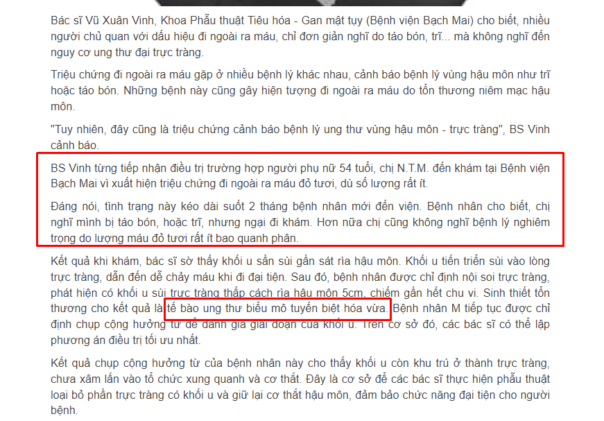 Dưới đây là trường hợp bệnh nhân N.T.M 54 tuổi đến khám ở bệnh viện Bạch Mai vì xuất hiện triệu chứng đi ngoài ra máu tươi. Vì chủ quan và ngại nên cố kéo dài, đến khi thăm khám phát hiện khối u sần sùi ở rìa hậu môn, sinh thiết cho kết quả ung thư biểu mô tuyến biệt hóa vừa.