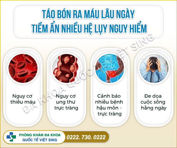 Tất cả các căn bệnh gây ra hiện tượng táo bón ra máu lâu ngày nêu trên đều mang đến những ảnh hưởng cho sức khỏe, thậm chí là nguy hại đến tính mạng. Tốt hơn hết, người bệnh nhanh chóng đến địa chỉ y tế chuyên khoa để thăm khám, chữa trị kịp thời.