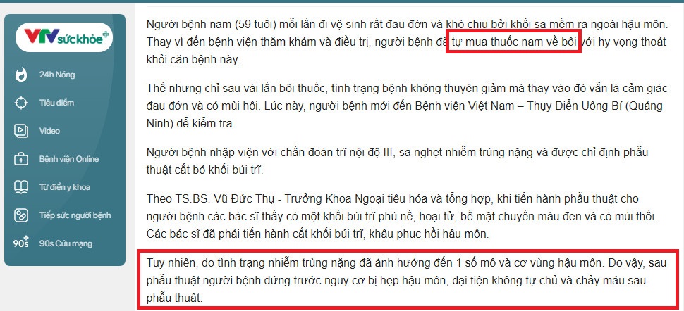 Một trường hợp tự ý chữa trĩ bằng thuốc nam rồi gặp phải biến chứng phù nề, hoại tử do VTV đưa tin