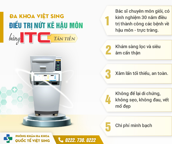 Hiện nay, phương pháp hỗ trợ chữa trị nứt kẽ hậu môn chủ yếu là nội khoa kết hợp với ngoại khoa. Đối với nứt kẽ hậu môn, bác sĩ chuyên khoa của Phòng khám Đa khoa quốc tế Việt Sing Bắc Ninh chỉ định phương pháp: Đông – Tây y kết hợp ITC.